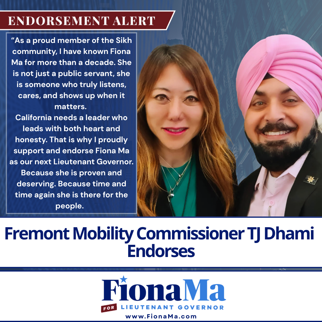 Fremont Mobility Commissioner TJ Dhami Endorses Fiona Ma for Lieutenant Governor